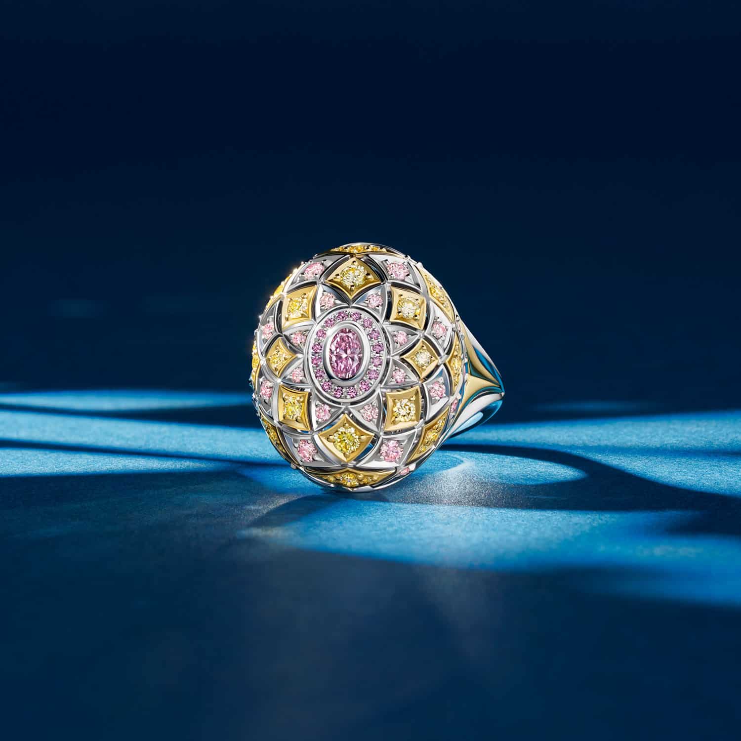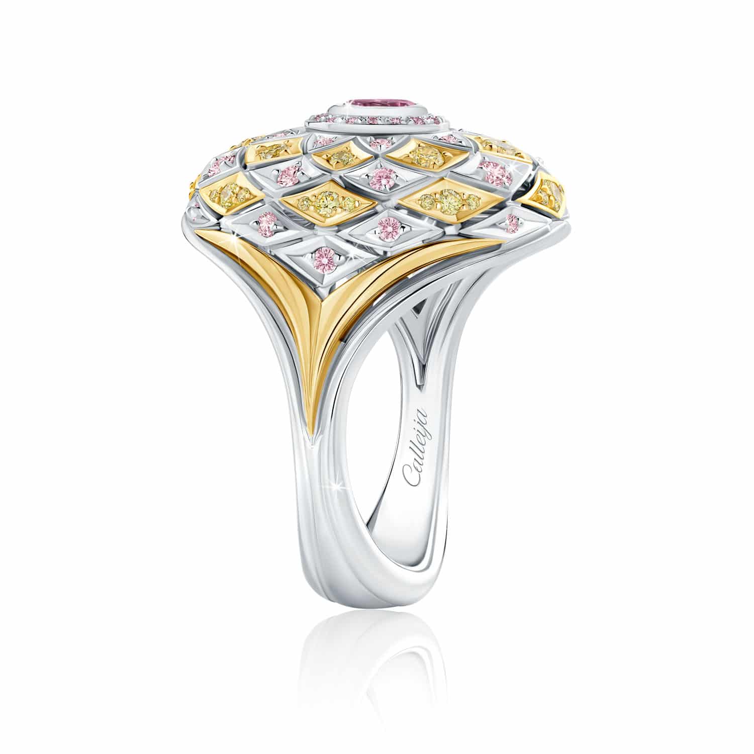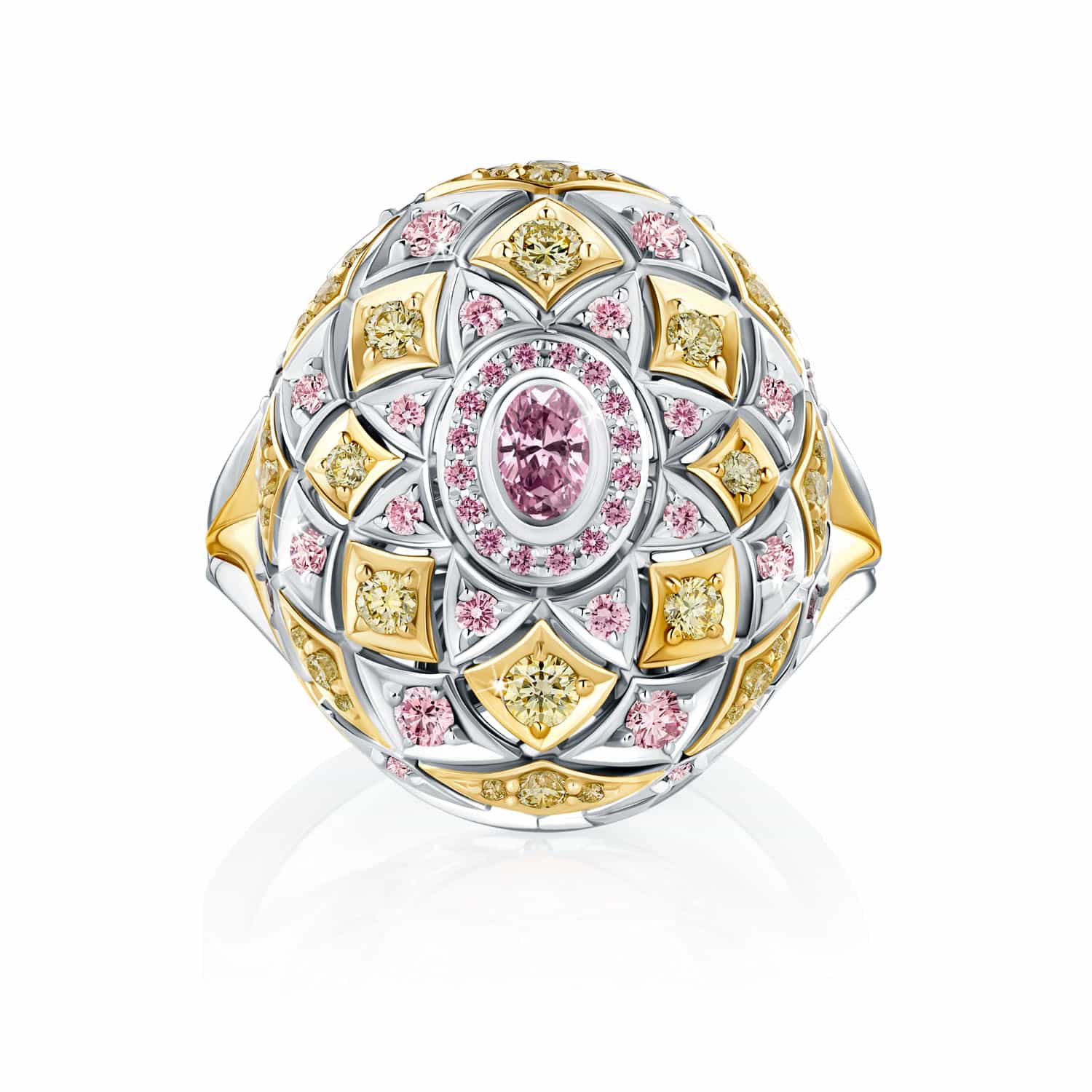 | Accent Gem Details | Aetheria also features: Sixteen round brilliant cut Australian Argyle Pink Diamonds™ totalling 0.05ct, Colour 5PP, Clarity SI Twenty-six round brilliant cut Australian Argyle Pink Diamonds™ totalling 0.38ct, Colour 6PR, Clarity SI Thirty-two round brilliant cut Yellow Diamonds™ totalling 0.48ct, Colour FY, Clarity SI Fourteen round brilliant cut White Diamond™ totalling 0.08ct, Colour D, Clarity VVS-VS |